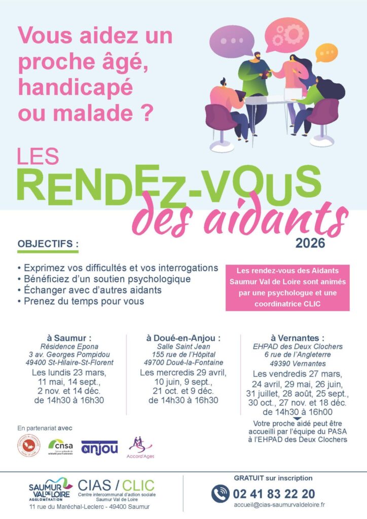 Le CIAS Saumur Val de Loire propose un programme d’accompagnement à destination des proches aidants du territoire. Ces rendez-vous, gratuits et sur inscription, offrent un temps privilégié pour s’informer, partager son expérience et rompre l’isolement.